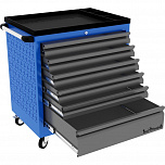 6 ящиков. Для хранения инструмента в ЕВРОЛОЖЕМЕНТАХ. Боковые панели с перфорацией (для установки аксессуаров). Цельносварная конструкция корпуса тележки. Центральный замок Euro-Lock. Шариковые направляющие полного выдвижения. Размеры (высота x ширина x глубина): 850 х 700 х 460 мм. Вес: 58,8 кг.