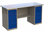 Двухтумбовый. Допустимая нагрузка на столешницу 1000 кг. Опорные элементы выполнены сварными из холоднокатаной стали. Для выполнения сборочных, ремонтных, слесарных, монтажных и других видов работ на производстве, в сервисных центрах, мастерских, гаражах, а также для обучения технологии в учебных заведениях. Комплектуется полкой-стенкой, расположенной под столешницей для удобного размещения габаритного инструмента и оснастки. Размеры верстака: 855x1796x696 мм. Вес: 105 кг. Поставляется в 4 комплектациях на выбор.