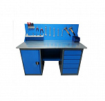 Двухтумбовый. Допустимая нагрузка на столешницу 1000 кг. Опорные элементы выполнены сварными из холоднокатаной стали. Для выполнения сборочных, ремонтных, слесарных, монтажных и других видов работ на производстве, в сервисных центрах, мастерских, гаражах, а также для обучения технологии в учебных заведениях. Комплектуется полкой-стенкой, расположенной под столешницей для удобного размещения габаритного инструмента и оснастки. Размеры верстака: 855x1796x696 мм. Вес: 121 кг. Поставляется в 4 комплектациях на выбор.