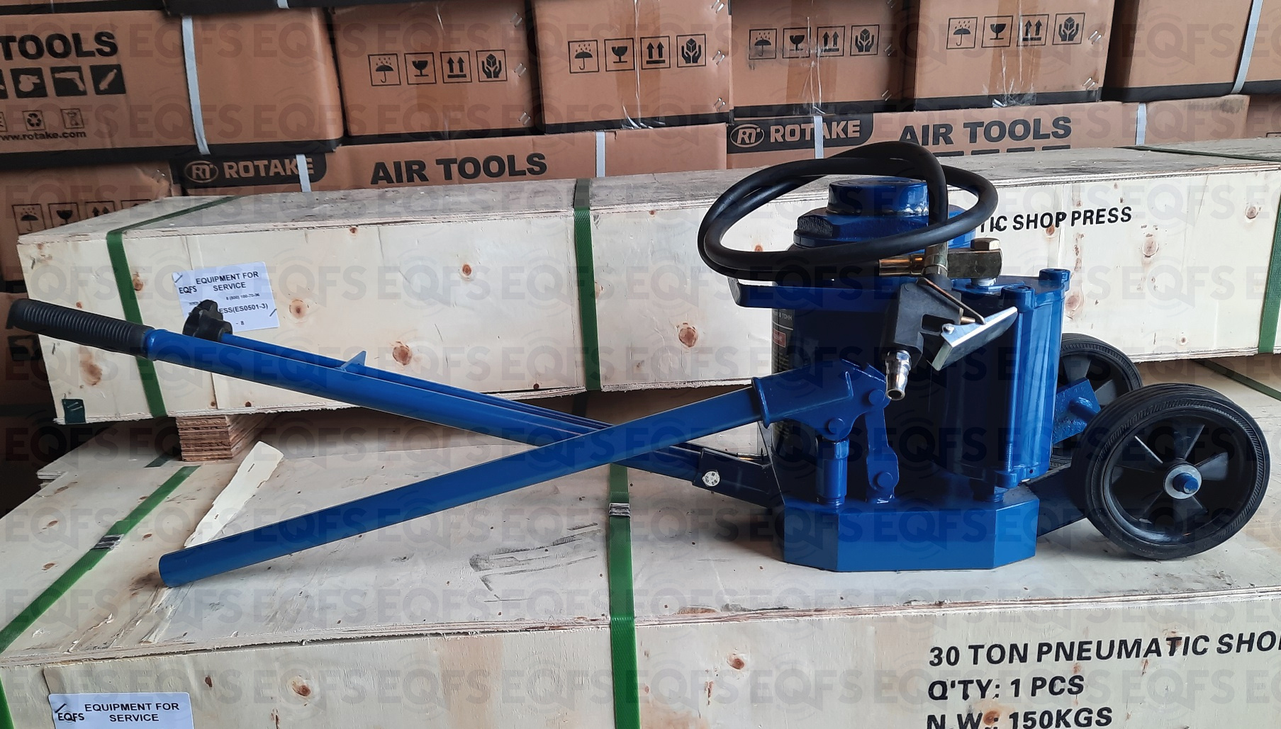 Увеличенный диаметр металлических колес домкрата, позволяет легко транспортировать его по не ровным поверхностям цеха.