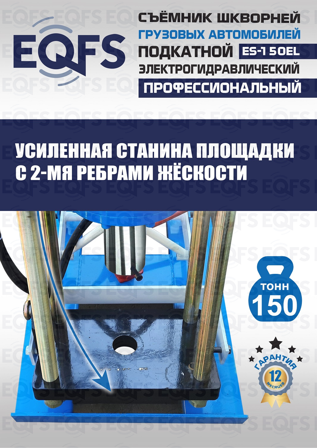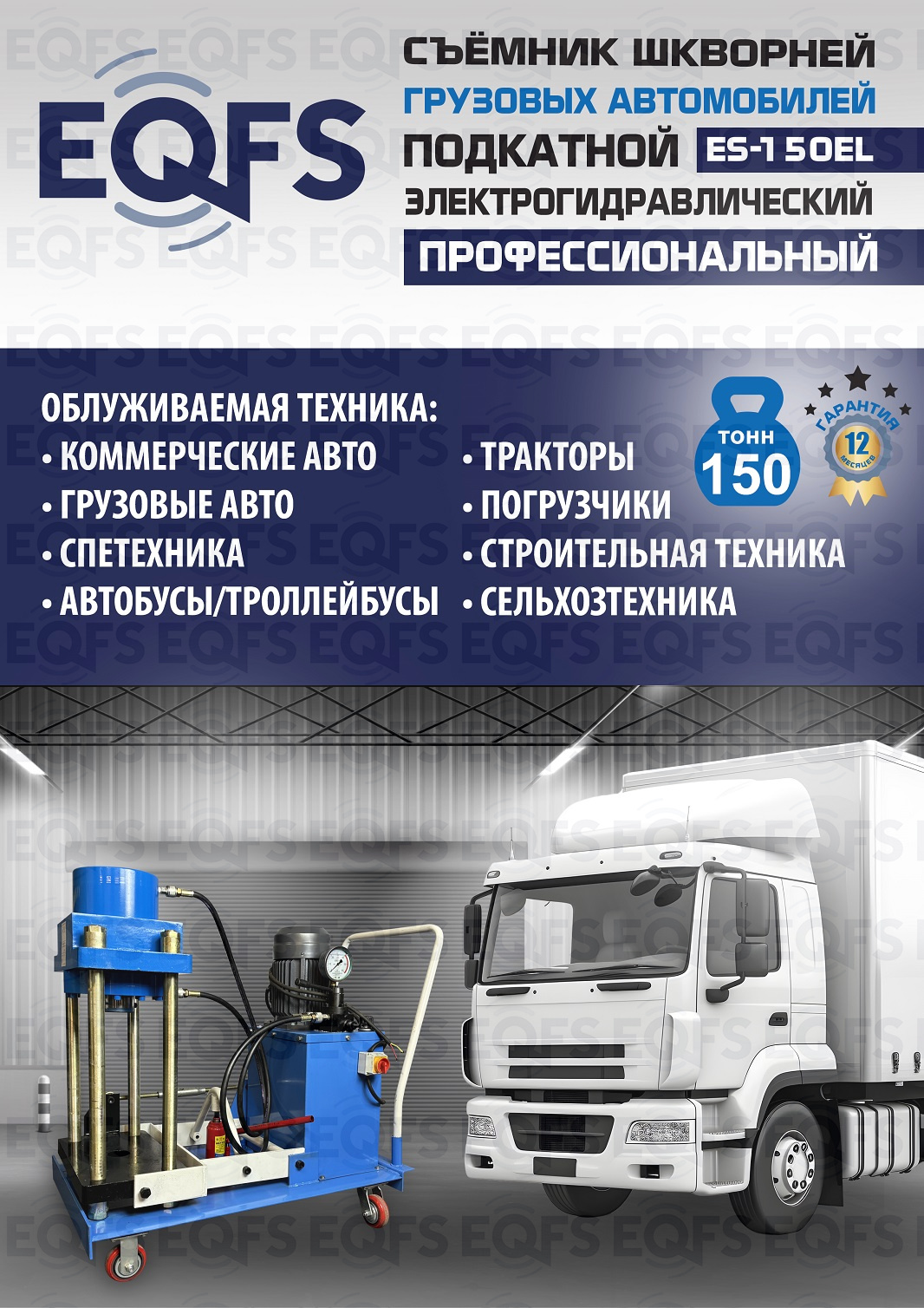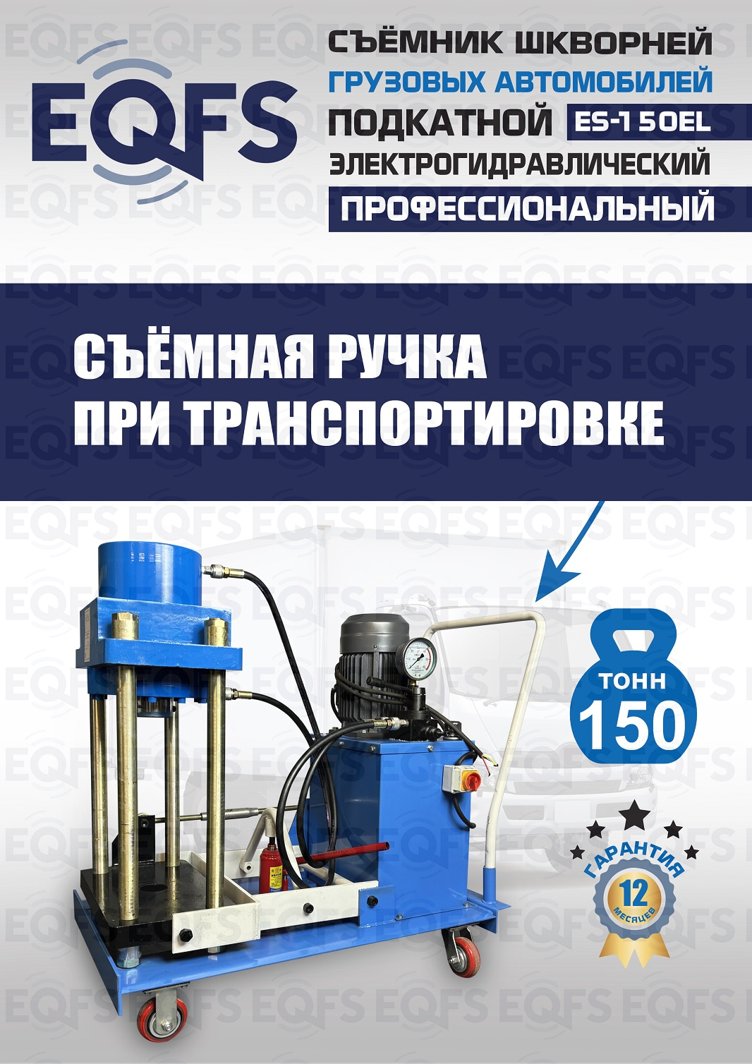 Сокращает время ремонта. Позволяет работать под разными углами 1 человеку. Мобильный. Для выпрессовки шкворней из поворотной цапфы погрузчиков, тракторов, строительной техники, коммерческих и грузовых авто отечественного и импортного производства: MAN, MERCEDES, SCANIA, VOLVO, Корейские и Китайские авто. Электрогидравлический привод. Рабочее окно 400x320 мм. Усилие 150 тонн.