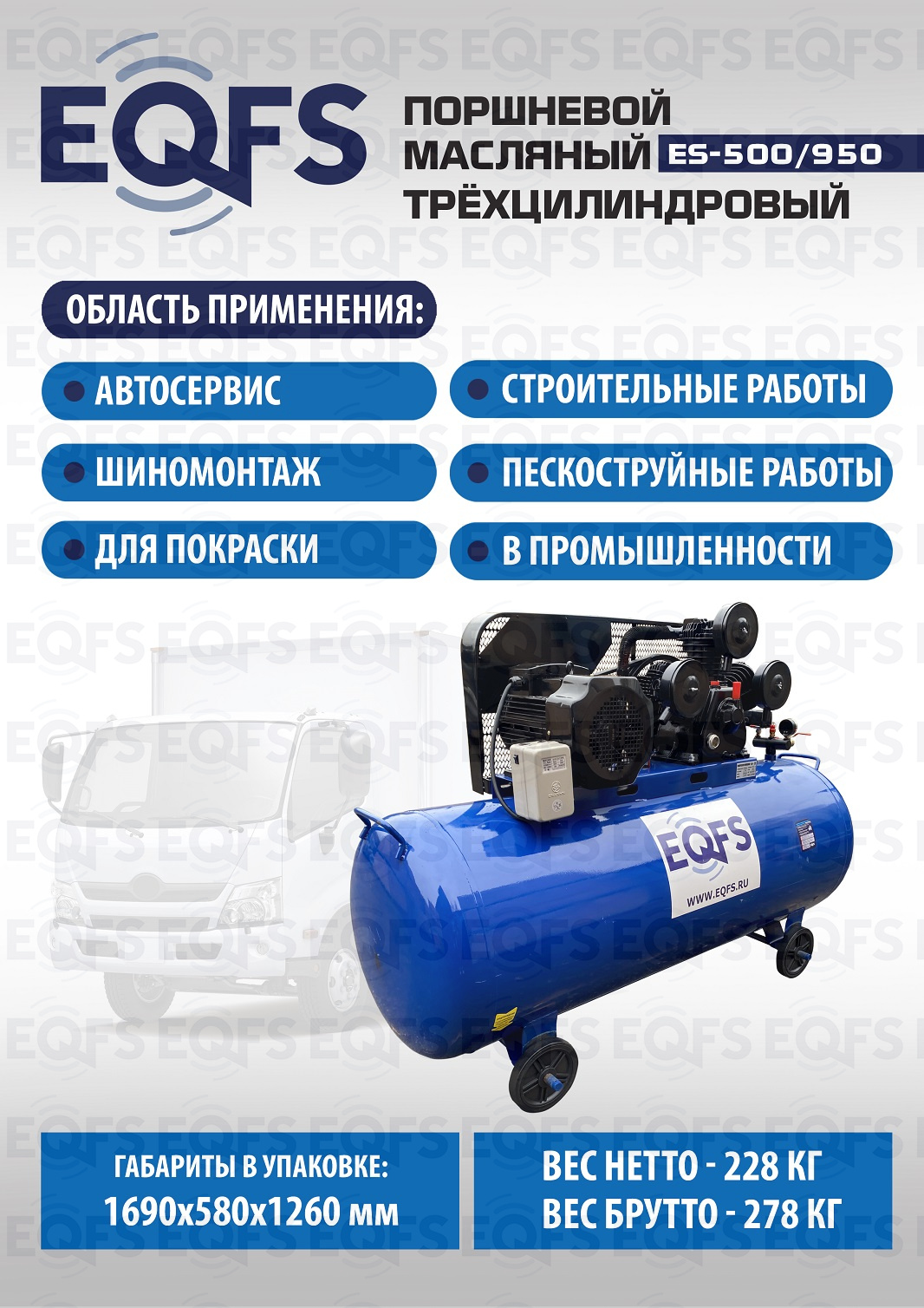 Компрессор воздушный, передвижной, поршневой, масляный, трёхцилиндровый. Быстро достигает нужного давления. Трёхпоршневая головка двигателя уменьшает износ деталей и увеличивает срок службы. Ремённый привод — предохранят мотор от поломки. Идеальное решение для шиномонтажа, автосервиса, строительства, покраски, промышленности. Давление 8 Атм. Производительность 950 л/мин. Мощность 7,45 кВт. Напряжение 380В. Ёмкость ресивера 500 л. Гарантия 12 месяцев.