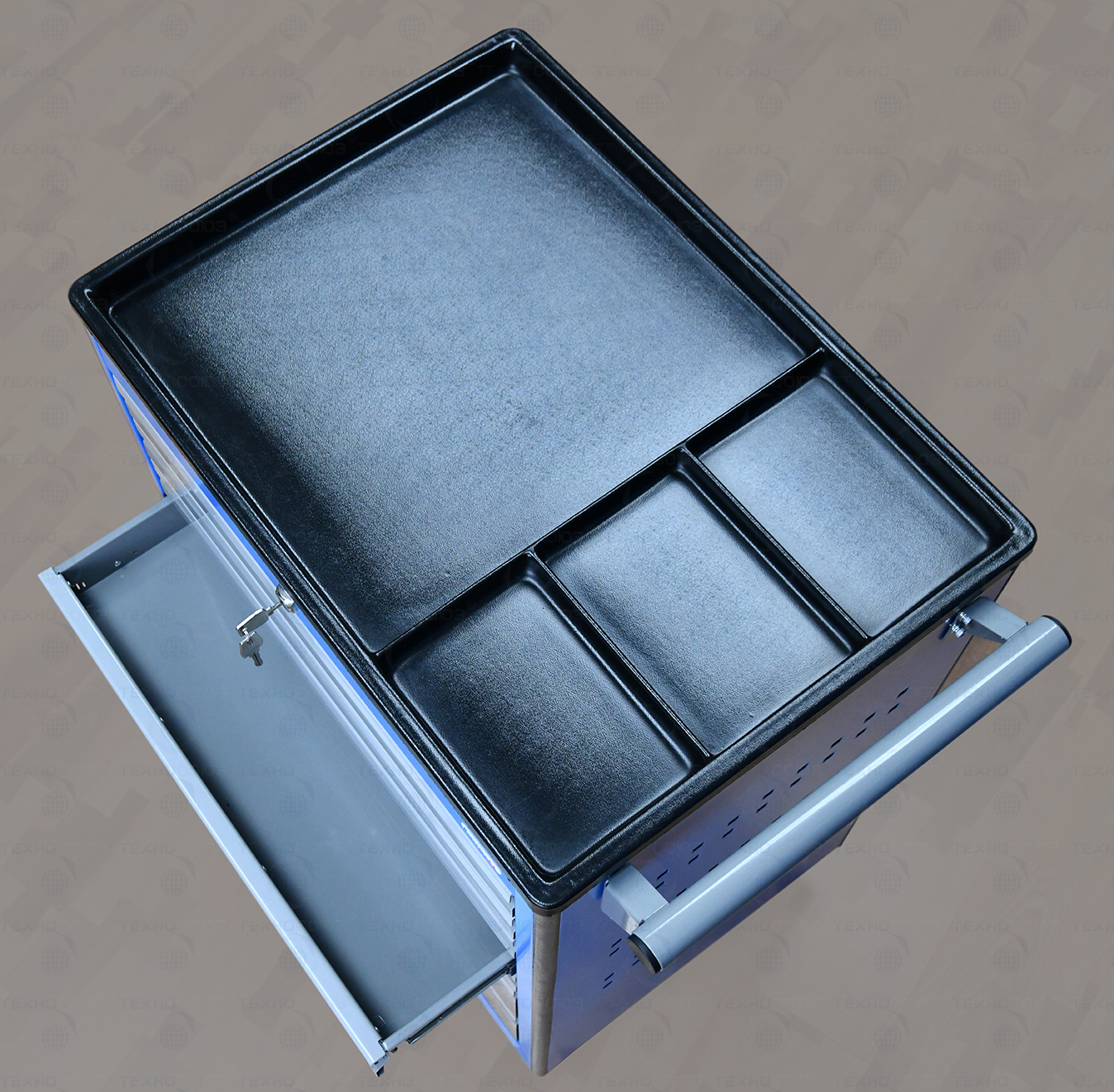 Ящики устанавливаются на шариковых телескопических направляющих полного выдвижения. Обеспечен свободный и плавный ход ящиков даже при полной загрузке. На лицевой панели каждого ящика установлена ручка-накладка. Каждый ящик снабжен клавишной системой антиоткрывания из оцинкованной стали, препятствующей самопроизвольному выдвижению ящиков, например, при наклоне или перемещении тележки.