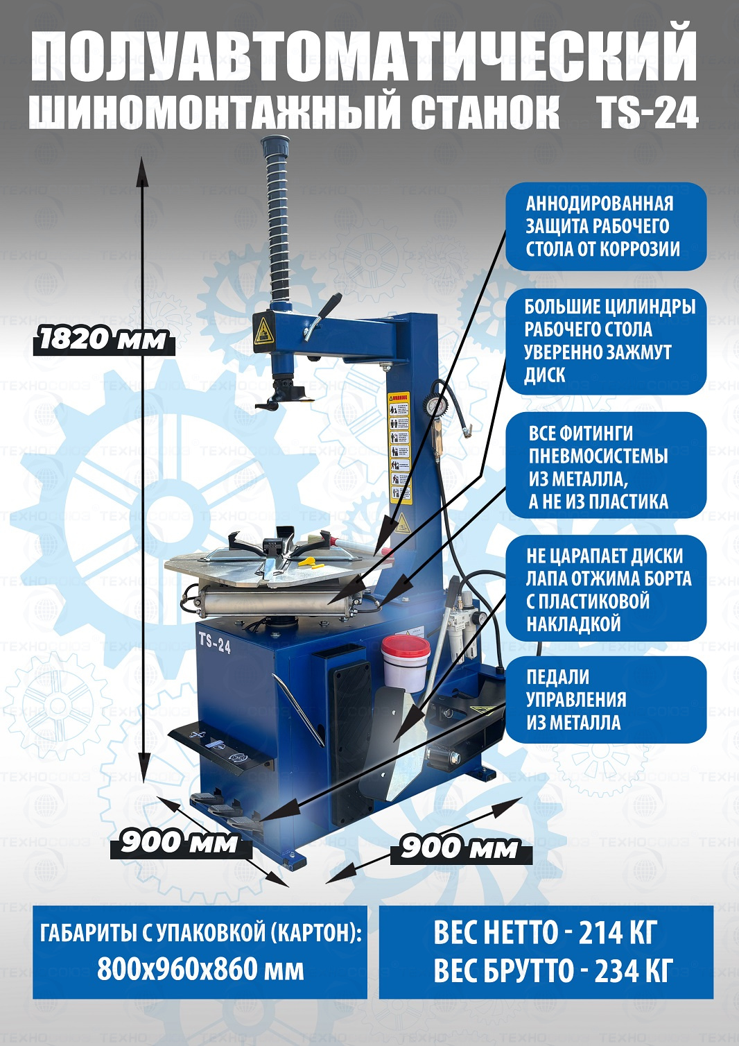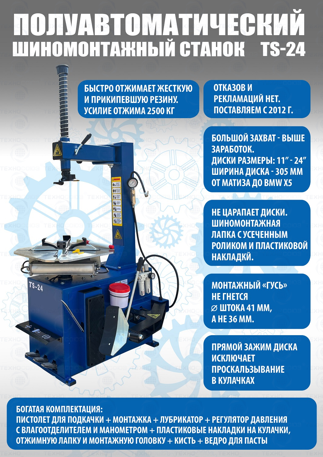 Шиномонтажного станка TS-24. Полуавтоматический. Квадратный стол. Для дисков:11÷24”. Усилие отрыва покрышки 2700 кг. В комплекте: пистолет с манометром для подкачки шин + монтажка + пластиковые накладки на зажимные кулачки + регулятор давления с влагоотделителем и манометром. Надежные - не подведут в сезон!!! Напряжение шиномонтажных станков 220В или 380В на выбор.