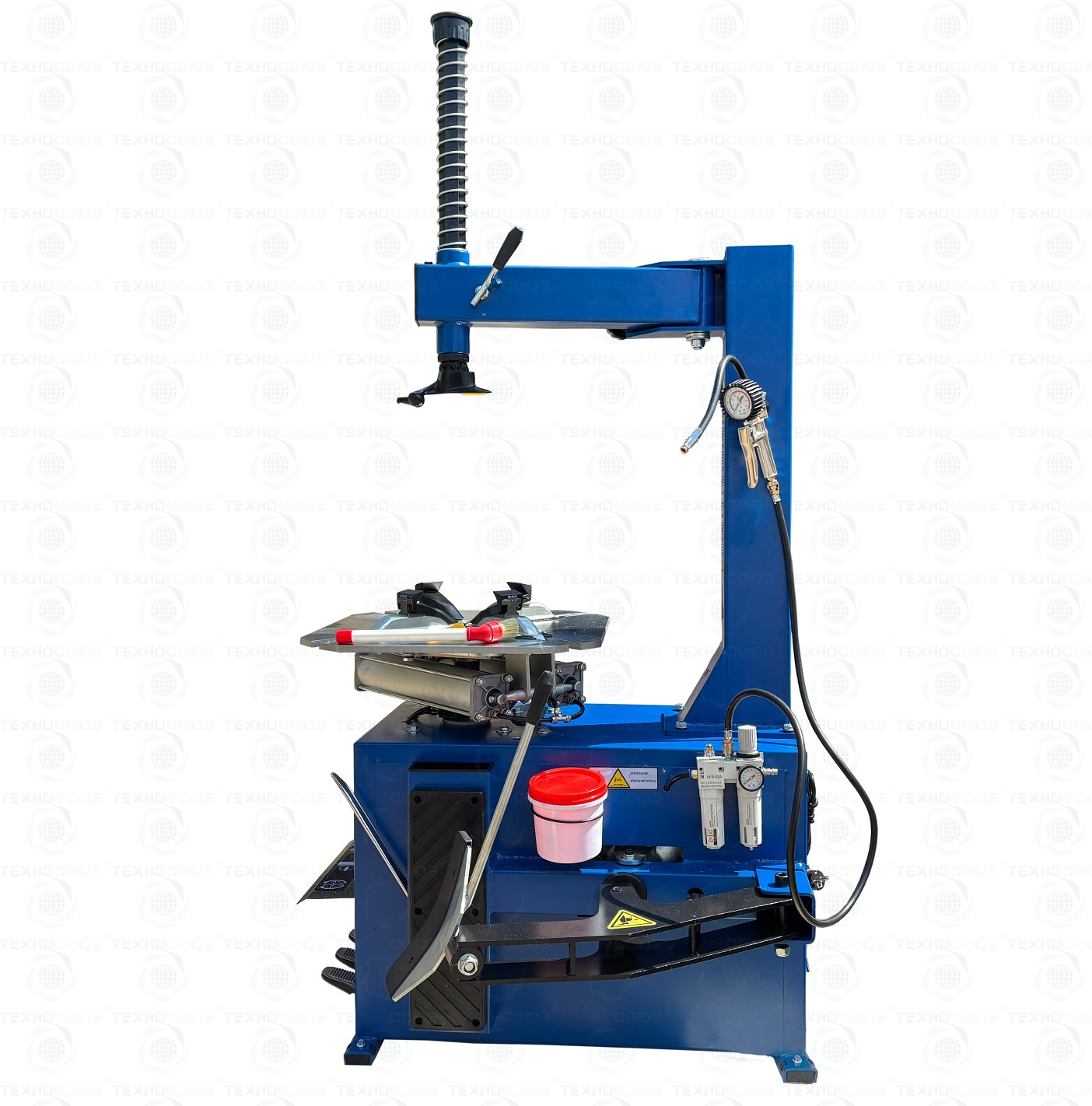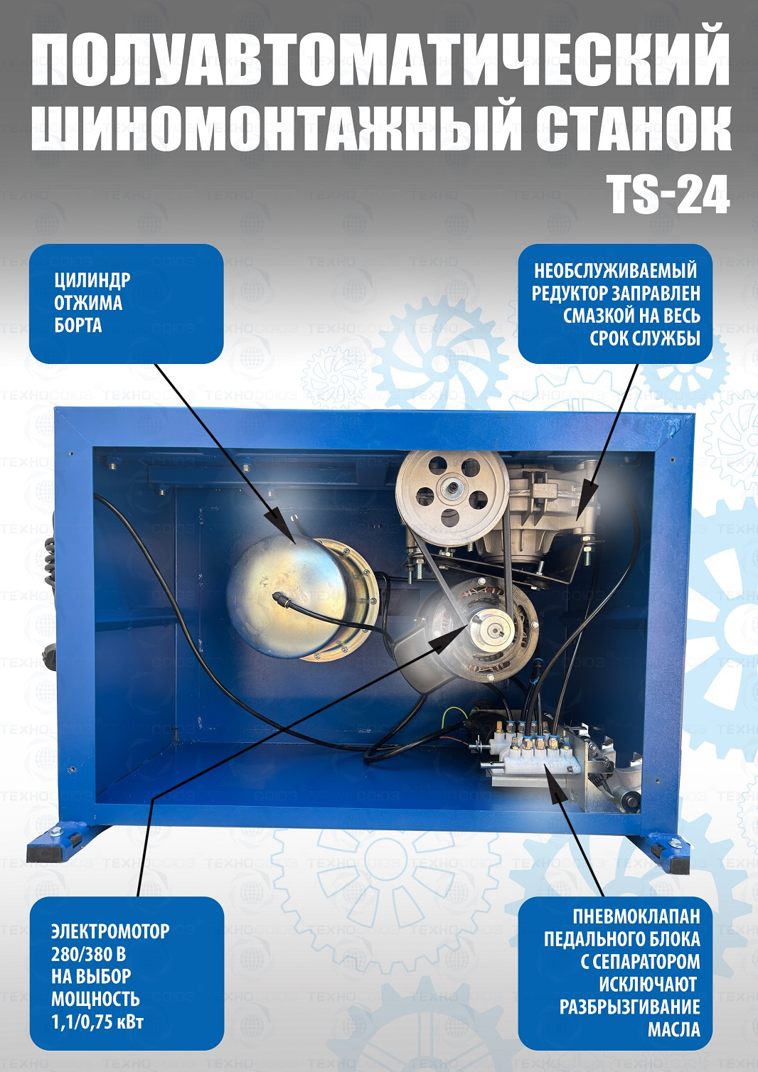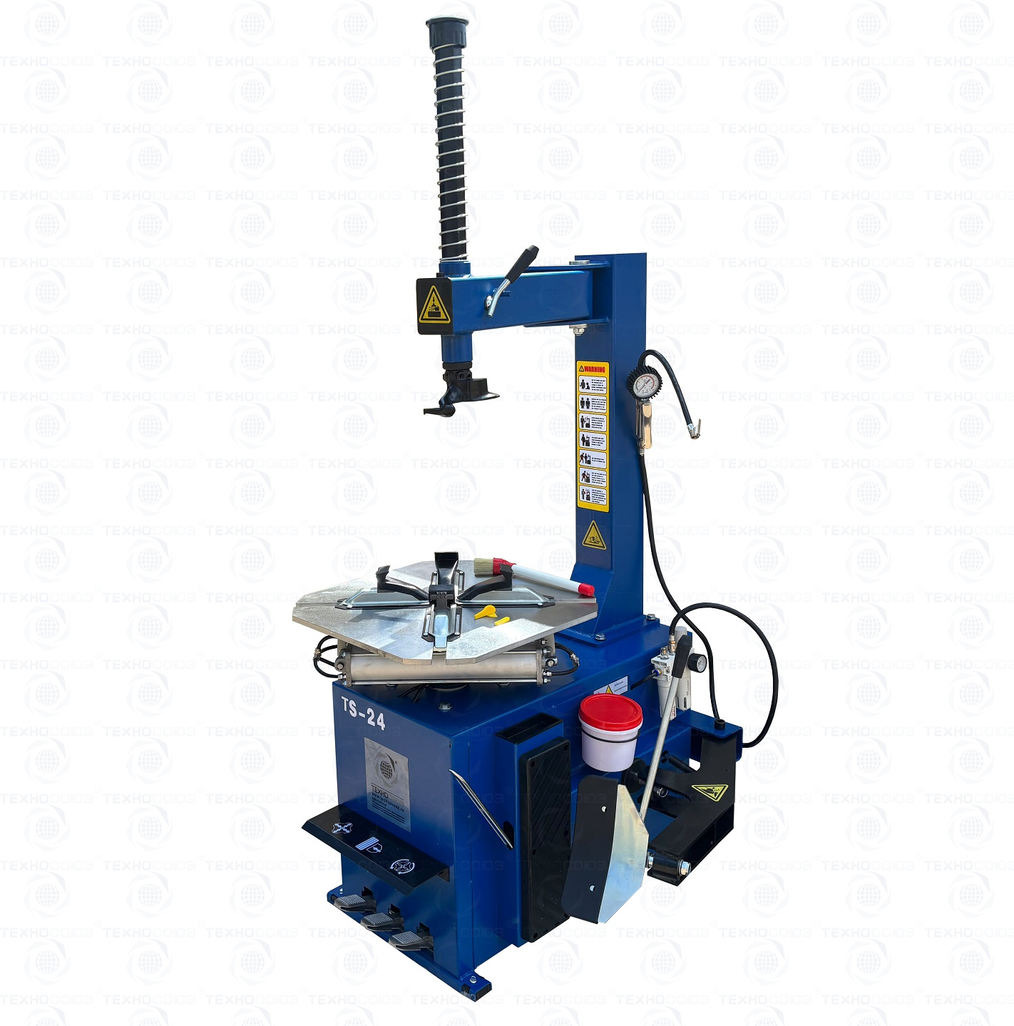 шиномонтажного станка TS-24. Полуавтоматический. Квадратный стол. Для дисков:11÷24”. Усилие отрыва покрышки 2700 кг. В комплекте: пистолет с манометром для подкачки шин + монтажка + пластиковые накладки на зажимные кулачки + регулятор давления с влагоотделителем и манометром