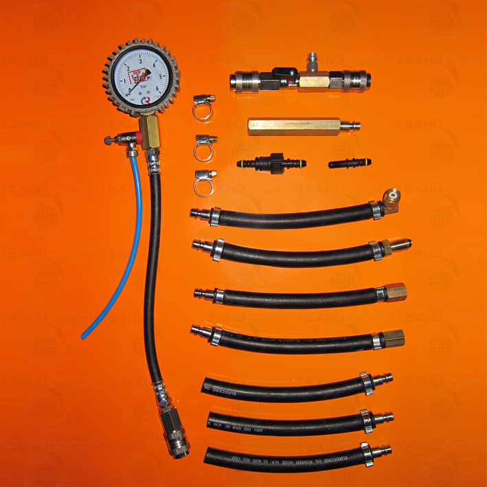 Комплектуется высокоточным манометром, диаметром 63 мм, ценой деления 0,1 бар, адаптерами, позволяющими производить измерения на автомобилях ВАЗ (ГАЗ - топливные рейки которых оснащены портом Шредера с резьбой 7/16"-20UNF). Адаптеры, входящие в комплект, позволяют подключаться в различных точках топливной магистрали.