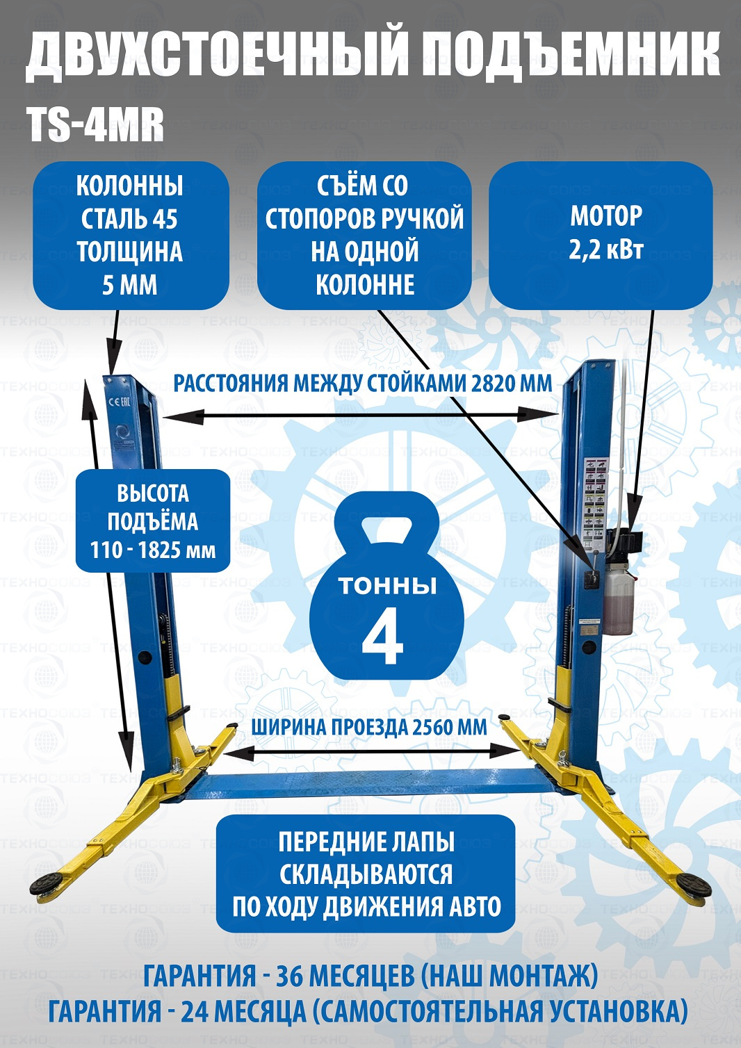 TS-4MR Подъемник 2-хст. г/п 4 т съем-ручка+проставки (2025)