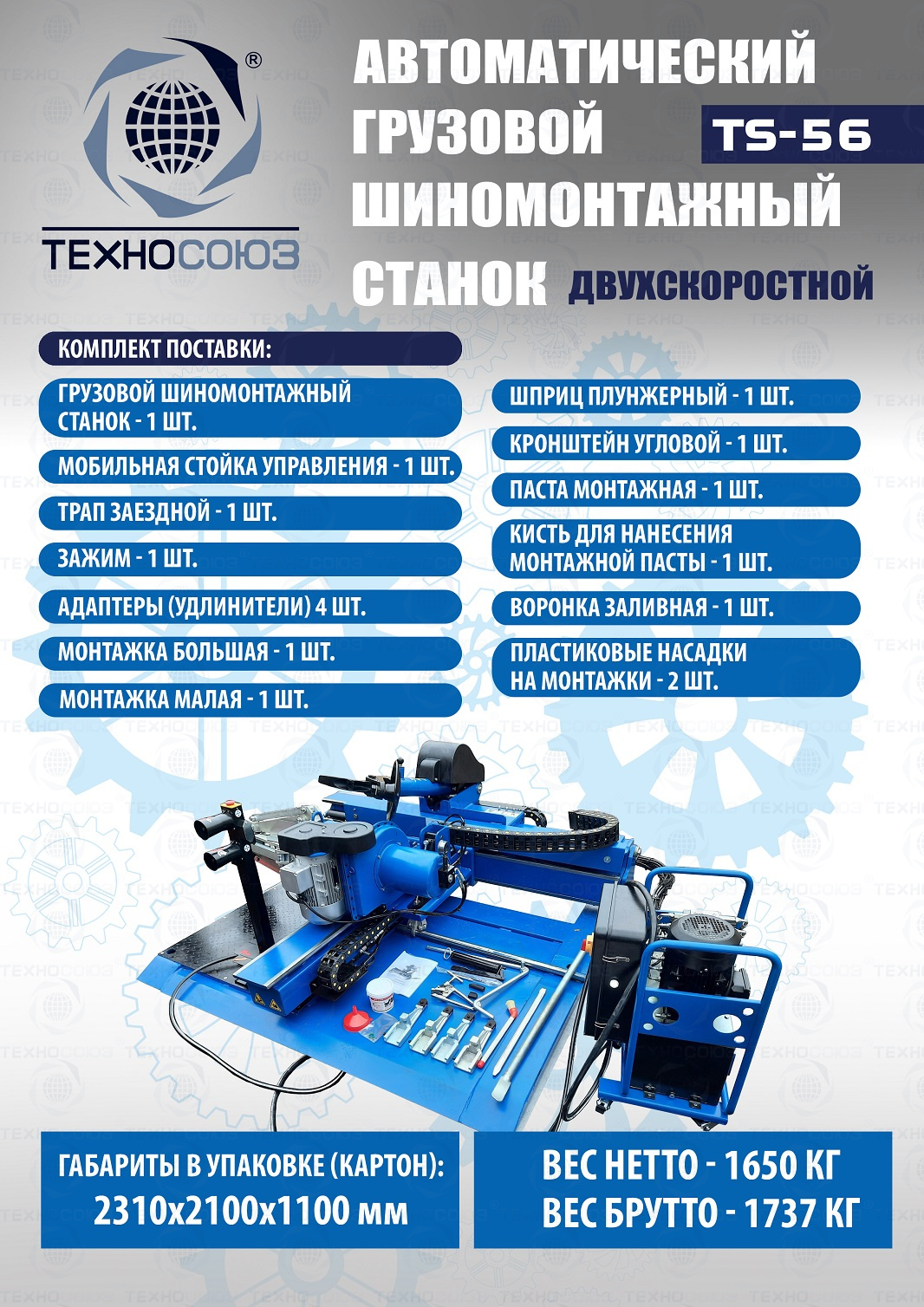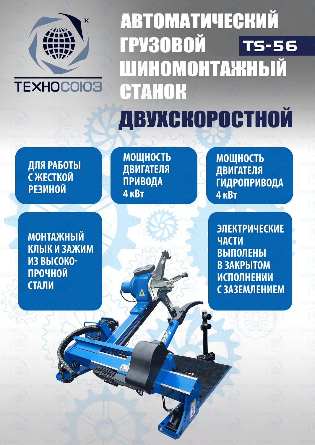 Двухскоростной. Моторы 4 + 4 кВт. Гидравлический насос – «BUCHER HIDRAULICS». Диски ALU, сталь, с кольцом и без 14÷60”. Колесо макс. Ø2600 мм, делает колеса "спарку" с шириной диска до 1400 мм. Вес колеса до 2000 кг. Гарантия до 18 мес. Грузовой шиномонтажный станок для тракторов, комбайнов, лесной и карьерной техники. Прост и удобен в эксплуатации. Отличное сочетание цены и технологических возможностей.